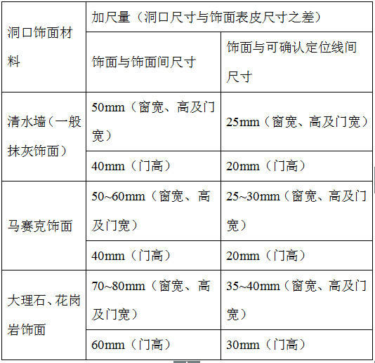 下表是几种常见饰面材料的门窗加尺量,后面所述的常规加尺均按此进行。