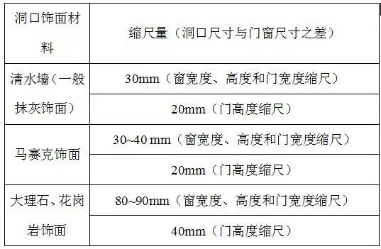 下表是几种较常见饰面材料使用的门窗缩尺量,后面所述的常规缩尺均按此进行。